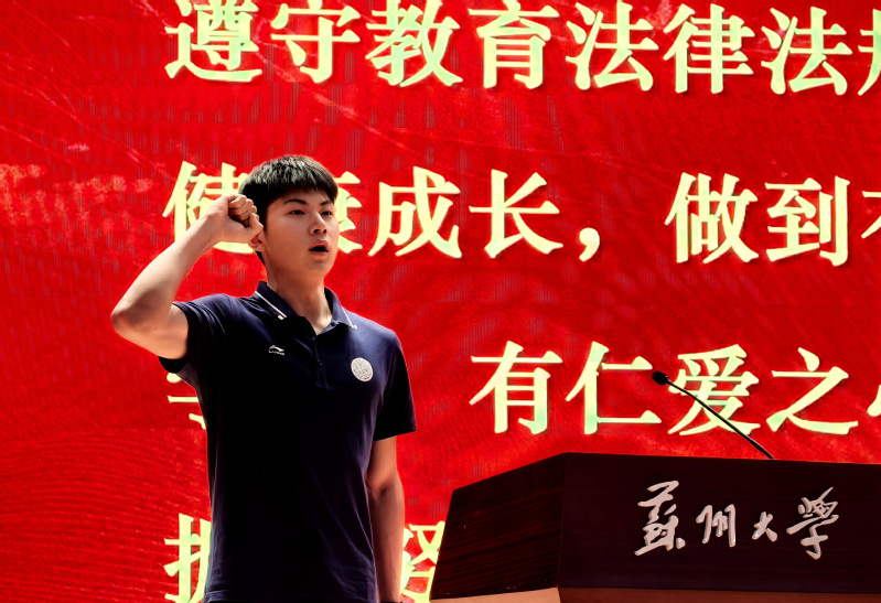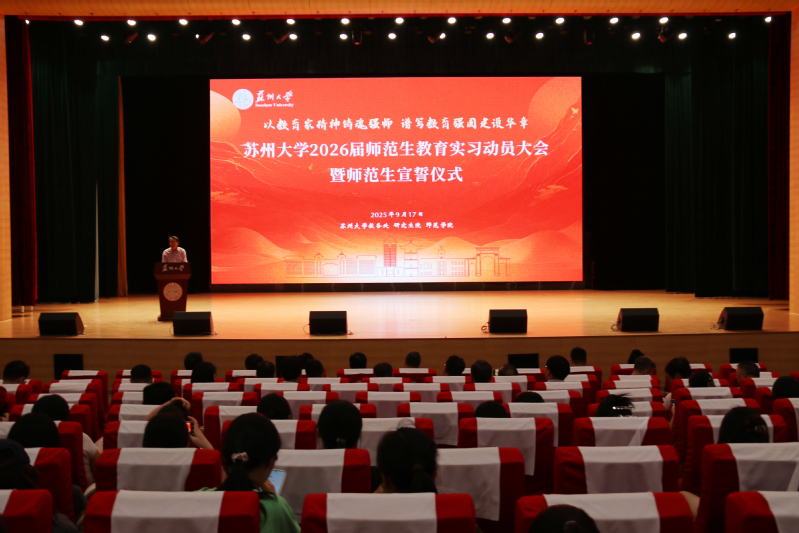 9月17日,我校2026届师范生教育实习动员大会暨师范生宣誓仪式在天赐庄校区存菊堂举行。校党委常委、副校长姚建林,教务处处长方亮、副处长资虹,研究生院副院长徐维英,江苏省苏州中学校长周祖华,苏州工业园区星海实验高级中学副校长马云秀,苏州大学附属中学副校长沈阳,“国优计划”指导教师代表,相关学院(部)领导、老师,2026届师范专业本科生及2026届全日制教育硕士(含“国优计划”研究生)出席大会。会议由师范学院院长兼基础教育管理办公室主任陈国安主持。