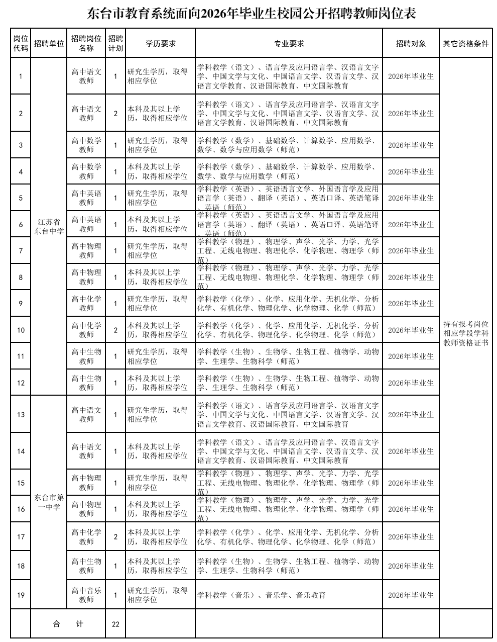具体岗位及要求见附件1《东台市教育系统面向2026年毕业生校园公开招聘教师岗位表》,以下简称《岗位表》。
