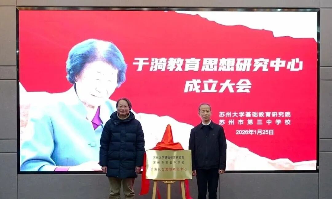 为大力弘扬教育家精神,以高质量的师资队伍实现苏州教育高质量发展,1月25日,由苏州大学基础教育研究院与苏州市第三中学校合作共建的“于漪教育思想研究中心”,正式挂牌成立。市委教育工委副书记徐卫、苏州大学师范学院院长兼基础教育管理办公室主任陈国安为中心揭牌。